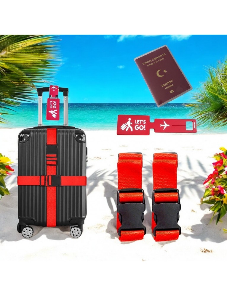 Valiz kemeri 2 adet + etiket 1 adet + Şeffaf pasaport kılıfı 1 adet